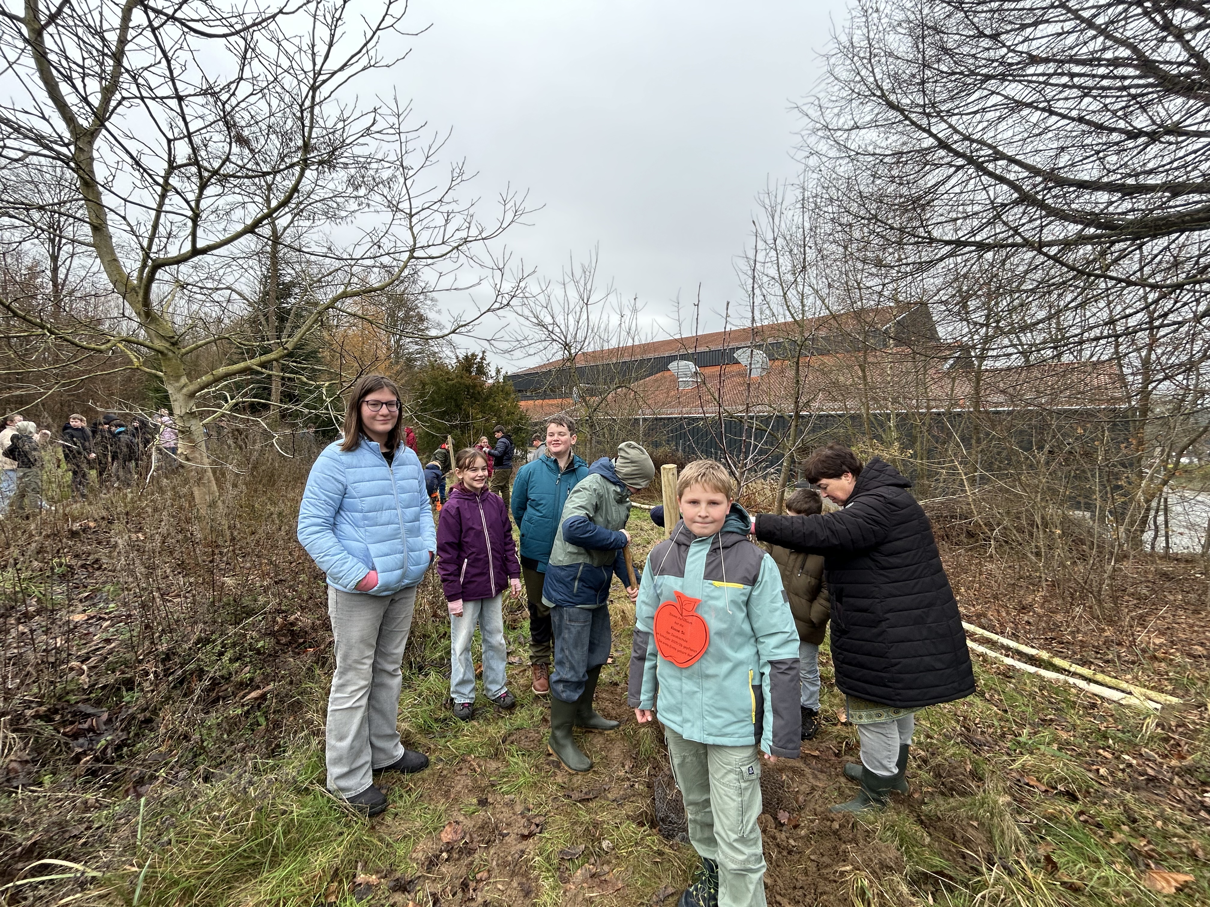 Diese klangvollen Namen gehören zu drei kleinen, neuen Apfelbäumen, die vor ein paar Tagen ihren neuen Wohnsitz im Schulbiotop bezogen haben. Jedes Jahr bekommt jede fünfte Klasse einen jungen Baum geschenkt. Diese Tradition gehört schon seit den Anfängen der Jacobischule dazu. Mittlerweile tragen diese Bäume Früchte und so konnte der „Saftladen“ der Schule in diesem Jahr mehr als 500 Kilogramm Äpfel in die Mosterei bringen. Der Saft aus den Äpfeln wird im Schulkiosk verkauft. Damit die Bäume gut anwachsen, müssen sie fachgerecht eingepflanzt werden, was die Schülerinnen und Schüler der Jahrgangsstufe 5 mit großer Begeisterung und viel Elan (zum Teil auch ohne Gummistiefel) gerne getan haben. Jetzt müssen die Bäume - und die Schüler – nur noch wachsen und groß werden, aber der Grundstock ist gelegt!