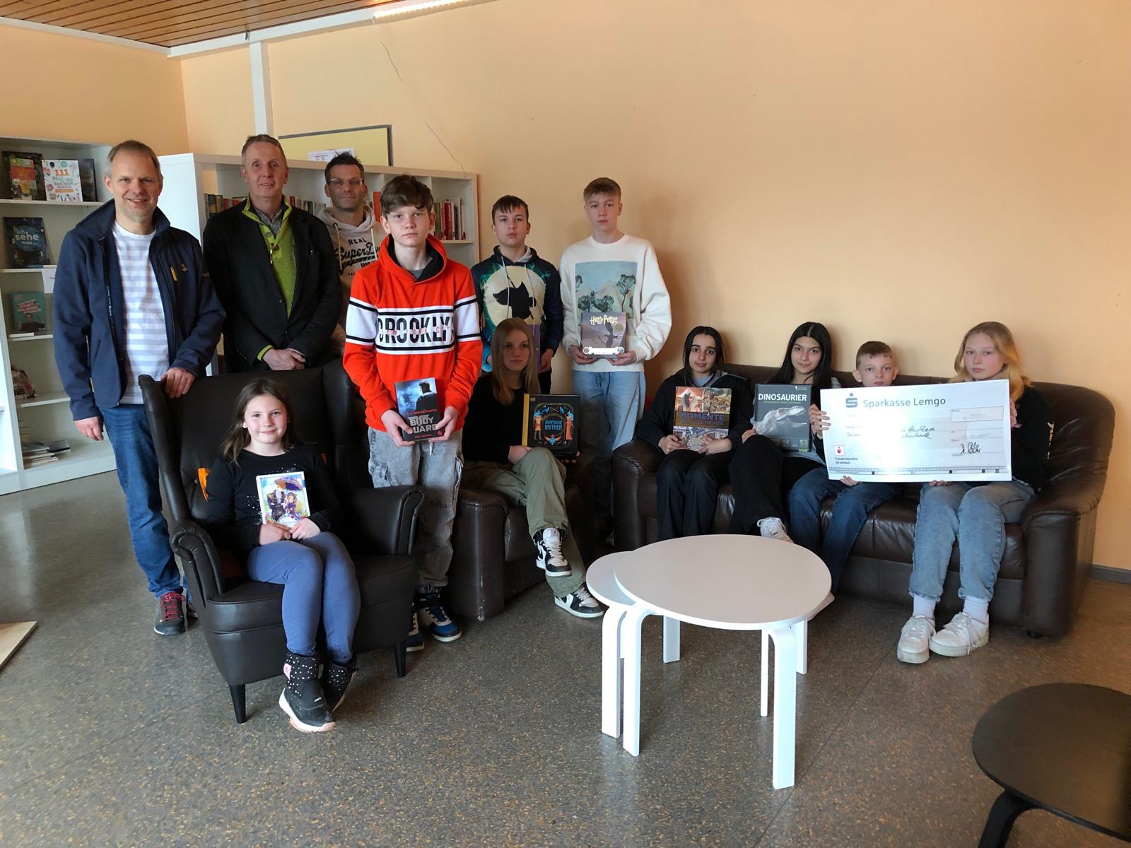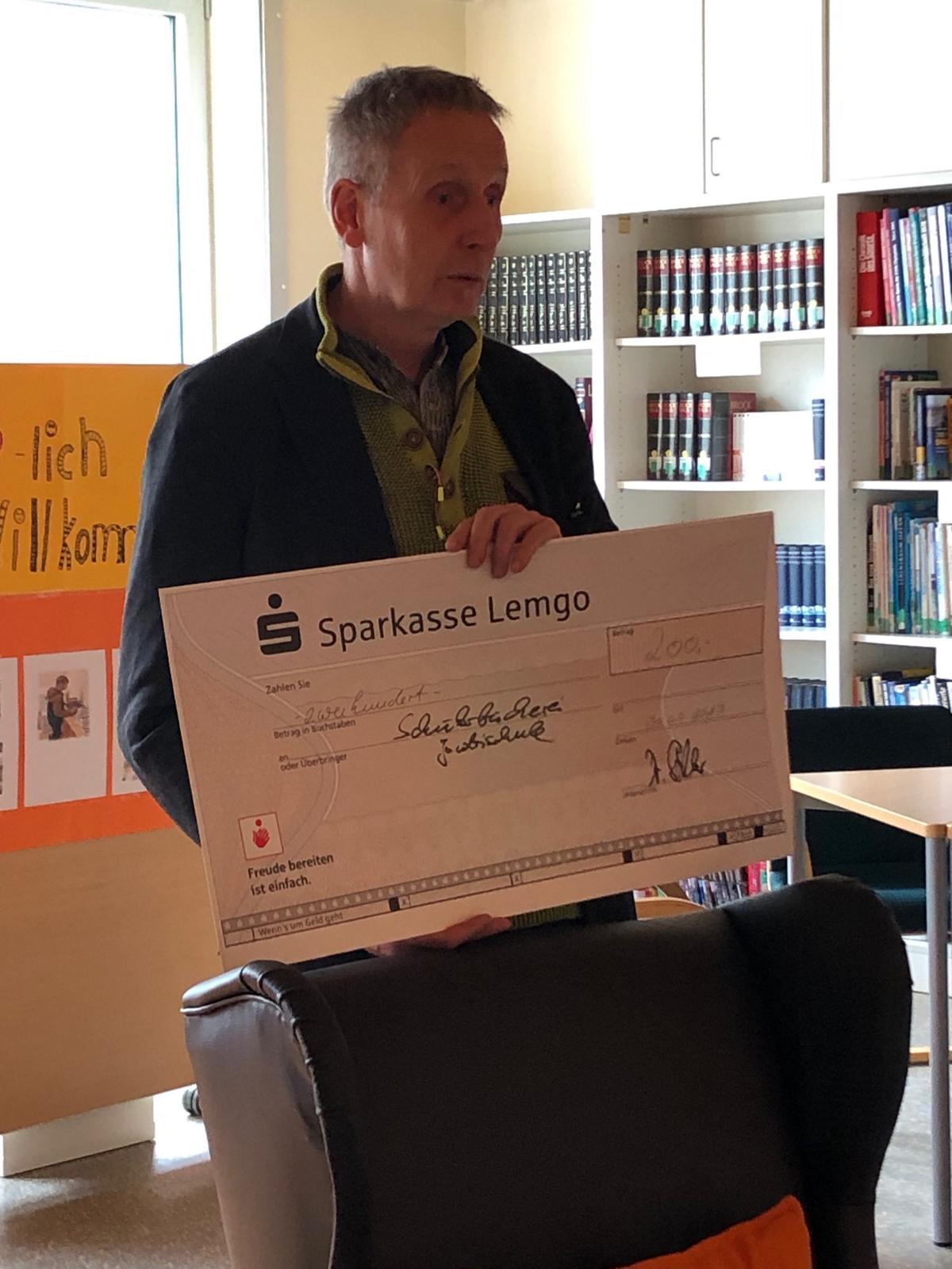 Erfreulicherweise hatte der Förderverein noch vor Corona stellvertretend für die Schülerbücherei an einem Wettbewerb der Sparkasse Lemgo teilgenommen und wurde mit einem Zuschlag von 1000 Euro bedacht. Dieses Geld wurde nun großteilig für neue Einrichtungsgegenstände eingesetzt. Für den restlichen Betrag suchte die Arbeitsgemeinschaft um Herrn Klaassen neue Bücher und Hörbücher bei der Buchhandlung Pegasus in Lemgo aus.