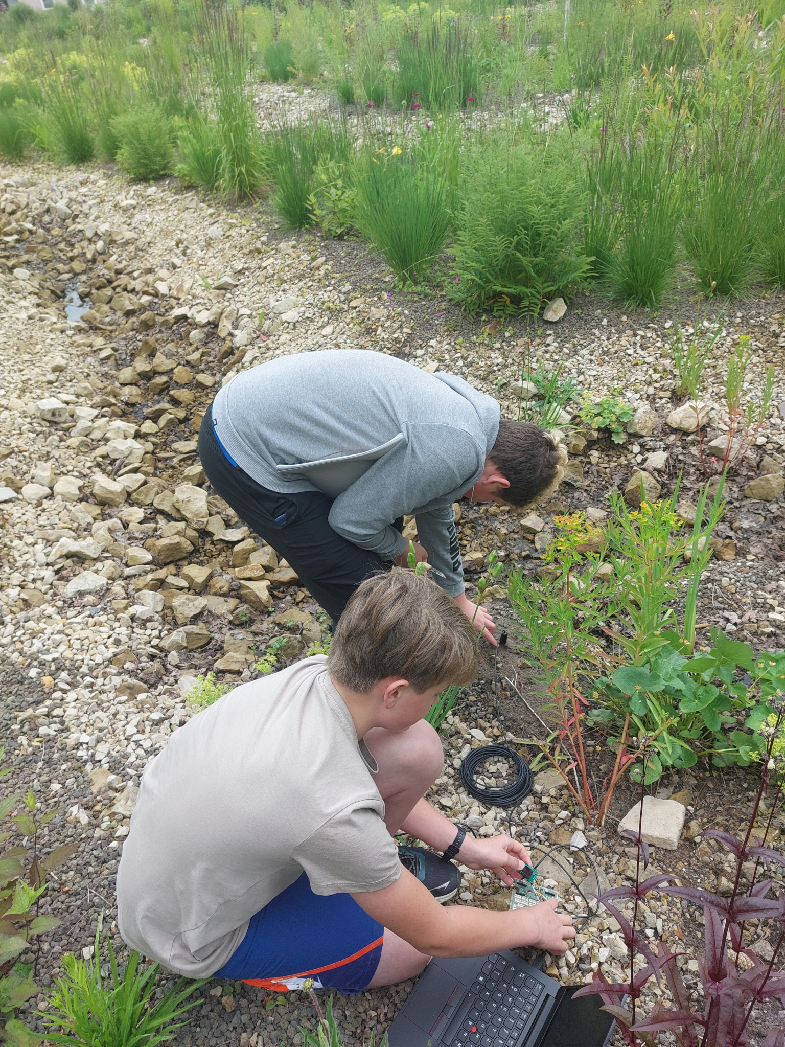 In der vom Bund initiierten digitalen Woche Anfang Juni erfuhren die Schüler*innen des WP 8-Kurse Technik und Naturwissenschaft mit Frau De Kossonou und Herrn Leenders, dass Digitalisierung mehr ist, als die Zettelwirtschaft auf Smartphones und Tablets anzulegen. Beim sogenannten Umweltmonitoring geht es unter anderem darum, den Erdboden mithilfe von speziellen Sensoren zu vermessen. Ist er zu trocken oder zu nass? Zu warm oder zu kalt? Und was kann ein Ultraschallsensor über Hochwassergefahr verraten?