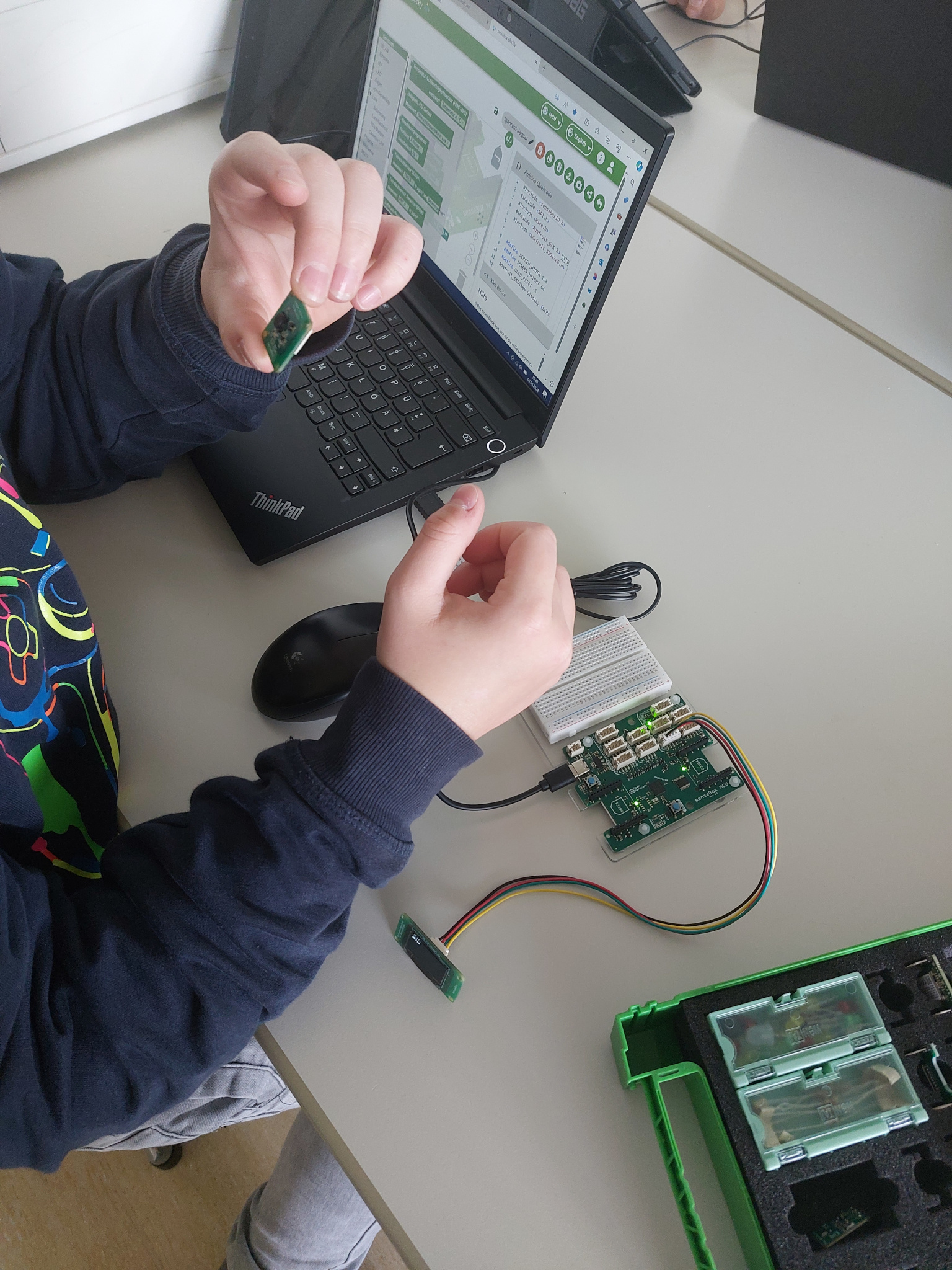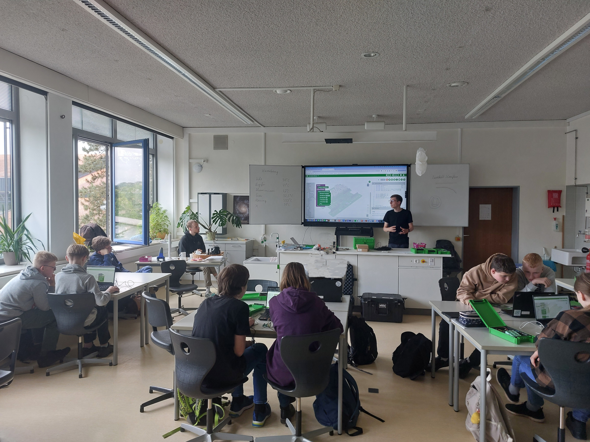 Durch das Zusammenbauen und Programmieren der Umweltsensoren konnten die Beteiligten einen Blick hinter die Kulissen des Smart CityProjekts der Kommunen Lemgo und Kalletal erhaschen. Die Schüler*innen entwickelten dabei Ideen, dass die Räumlichkeiten mit Temperatur- und Kohlenstoffdioxidsensoren ausgestattet werden könnten. Das wichtigste Argument war dafür, dass Herr Dr. Stiller so viel schneller erkennen könne, wann hitzefrei gegeben werden müsste. Auch bauten die Schüler*innen Sensoren und erhoben Daten zur Bodentemperatur und -feuchtigkeit rund um den Klimapark. „Den Jugendlichen und uns hat es viel Freude bereitet. Vor allem die Verknüpfung zwischen Technik und Naturwissenschaften war besonders schön zu erleben“, so Frau De Kossonou.