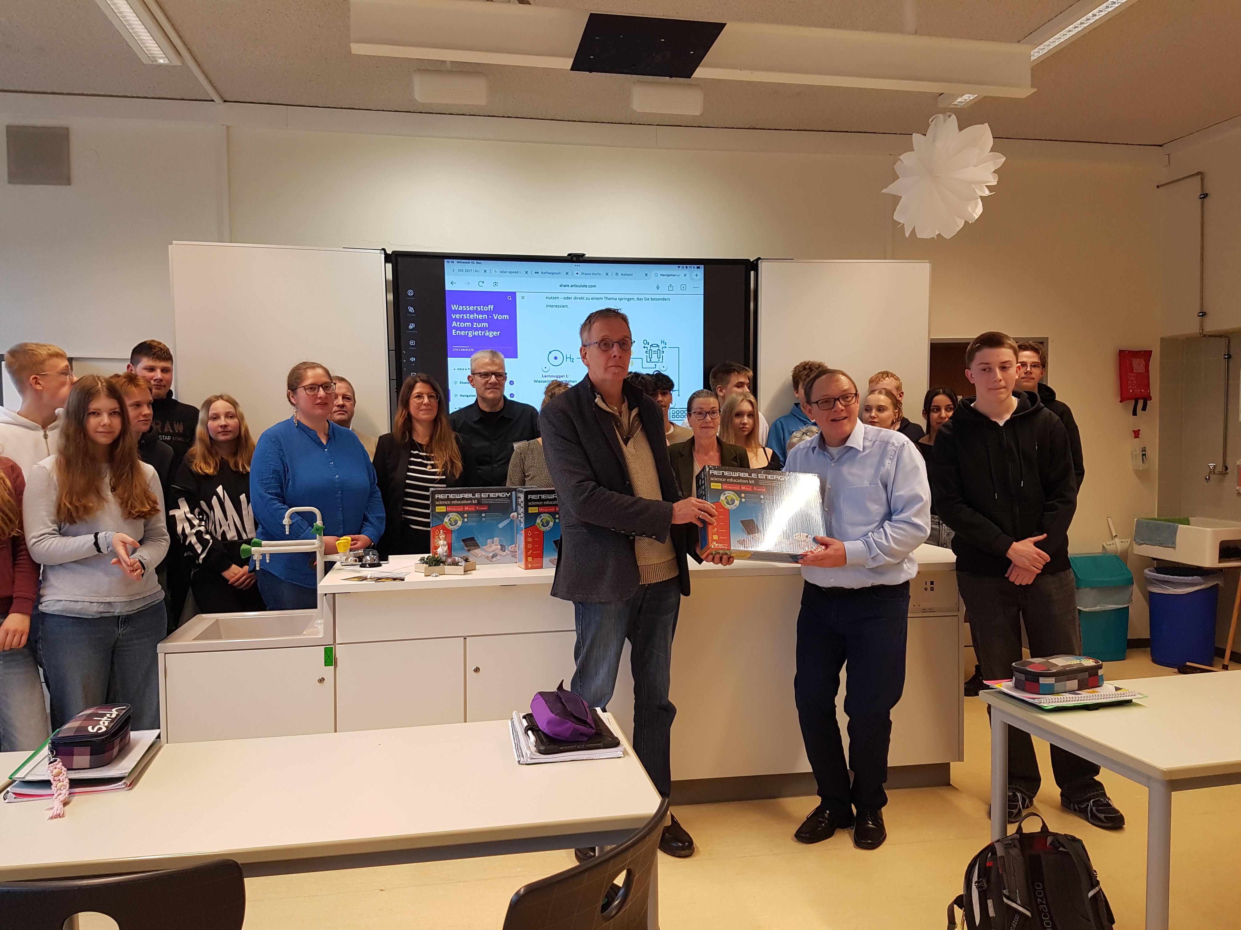 Das Projekt beschäftigt sich damit, Energie aus Sonne und Wind in grünen Wasserstoff als nachhaltiges Produkt aus der Region umzusetzen und wird wissenschaftlich begleitet durch die Fachhochschule des Mittelstands in Bielefeld, vertreten durch Frau Elisa Goldmann, die die digitale Aufarbeitung der Thematik unseren Schüler*innen vorstellte. Die FHM Bielefeld entwickelt sogenannte Lernnuggets für Interessierte, in denen eine virtuelle Begleiterin hilft, chemische Grundlagen, erneuerbare Energien und die verschiedenen Nutzungsmöglichkeiten zu verstehen. Bei unseren Schüler*innen kamen die Lernnuggets gut an. Besonders gefielen aber auch die Möglichkeiten für eine interessante berufliche Perspektive im Energiesektor, der Leuchtturmcharakter für das ganze Land hat. Um diese zukunftsorientierte Technologie besser zu verstehen, bekamen am 10.12.2025 die Schüler*innen der zehnten Klasse fünf Lernkits überreicht, die in der Jacobischule als Kooperationsschule im Chemieunterricht dafür genutzt werden können, die Gewinnung von grünem Wasserstoff nachvollziehbar zu machen und erneuerbare Energien somit auch spielerisch näher zu bringen.