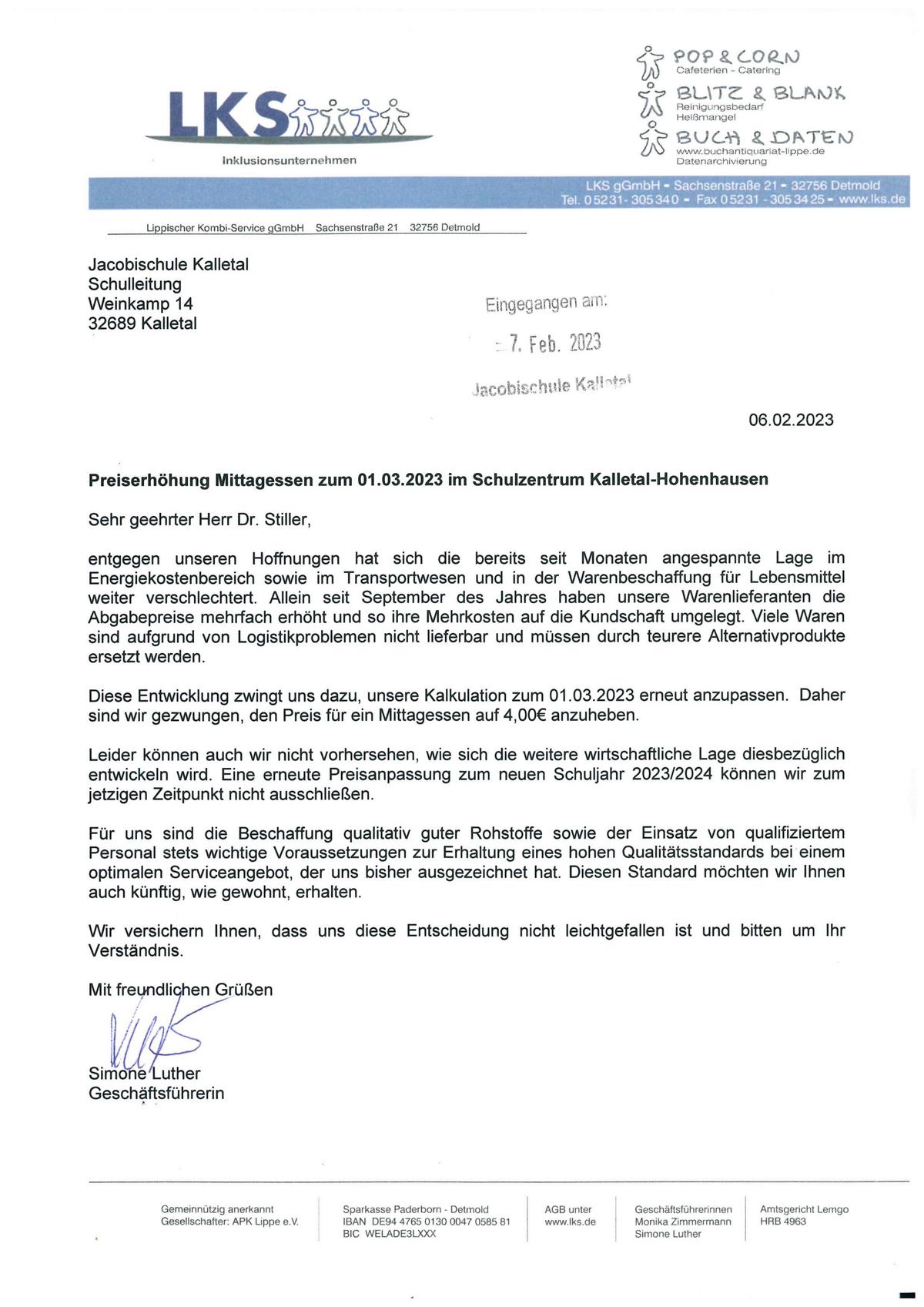 Leider sieht sich unser Caterer LKS gezwungen, aufgrund etlicher Preissteigerungen auch den Preis für das Mittagessen bei uns anzupassen.