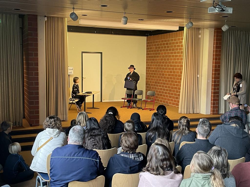 Anschließend begrüßte auch Bürgermeister Mario Hecker die Gäste im PZ und versprach, dass zeitnah auch die Aula der Jacobischule fertig gestellt werde und im Sommer ebenfalls die sanierte Sporthalle wieder zur Verfügung stehe. Dann ließen es die Mädels vom Profilkurs Zumba auf der Bühne richtig krachen und das Publikum forderte lautstark eine Zugabe ein. Den Abschluss bildete der Profilkurs Theater unter der Leitung von Sabine Senger und Annette Engelking vom lokalen Theaterverein, die ihr selbstgeschriebenes Stück “Der Mord an Mr. Aram” spielten und für den amüsanten Auftritt mit einem riesigen Applaus belohnt wurden. Auf dem Weg nach Hause konnte man viele zufriedene Gesichter sehen.