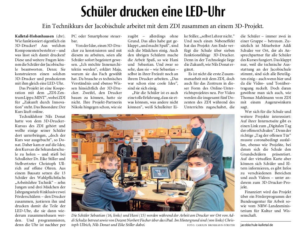 Der Kurs baut im Rahmen des Unterrichts eigene 3D Drucker. Und das besondere dabei: Die Experten, von denen sie unterstützt werden, sind nicht vor Ort, sondern der Kurs läuft online (mit einer Ausnahme: der Lemgoer Erfinder Addy Schulze gehört an unserer Schule ja quasi bereits zum Inventar und unterstützt die Schüler*innen in diesem Kurs auch mit seinem Know-How). Das ist auch im zdi Lippe.MINT bislang einzigartig und funktioniert auch nur aufgrund der hochwertigen digitalen Ausstattung an unserer Schule.
