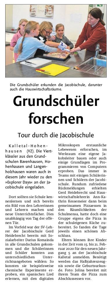 Sämtliche Viertklässler aus den Grundschulen aus Bavenhausen, Hohenhausen und Langenholzhausen waren auch in diesem Jahr wieder zu den Explorer Days an der Jacobischule eingeladen, um die Schule kennenzulernen und sich bereits ein Bild von den Lehrerinnen und Lehrern zu machen und neue Unterrichtsfächer zu erleben. Rundum zufriedene Rückmeldungen erhielten Gerd Heidebrecht und Hauswirtschaftslehrerin Ann-Kathrin Kessemeier nach den unterschiedlichen Unterrichtsangeboten dann beim gemeinsamen Pizzaessen in den Räumlichkeiten der Schulmensa, hatte doch eine Gruppe eigens die Pizza in der schuleigenen Küche zubereitet. So fanden die Tage jeweils einen schönen Abschluss.