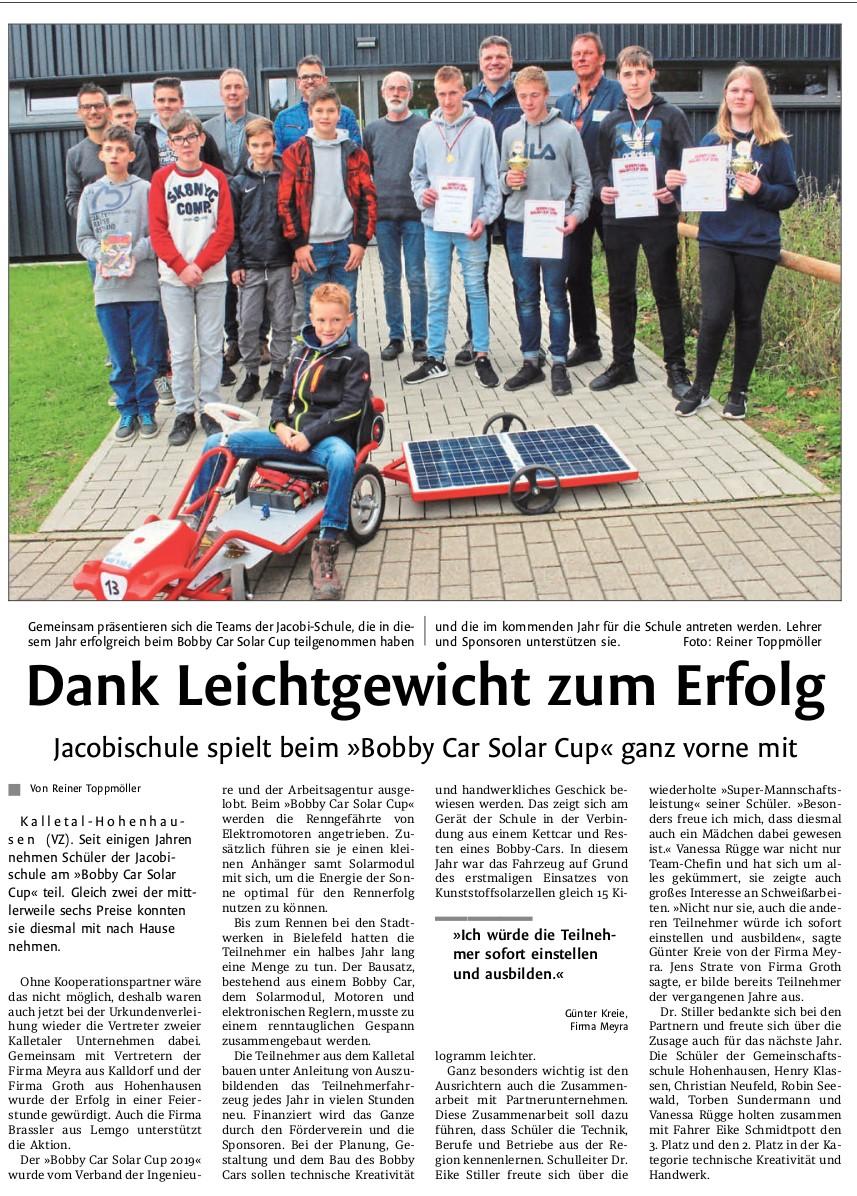 Bereits vor einigen Wochen berichteten wir, dass das Bobbycar Solarteam der Jacobischule um Teamchefin Vanessa Rügge und um Lehrer Nils Donat wieder überaus erfolgreich war und in 2 von 6 Wertungen auf dem Treppchen stand. Ein toller Erfolg, herzlichen Glückwunsch.