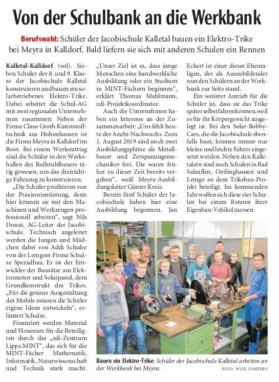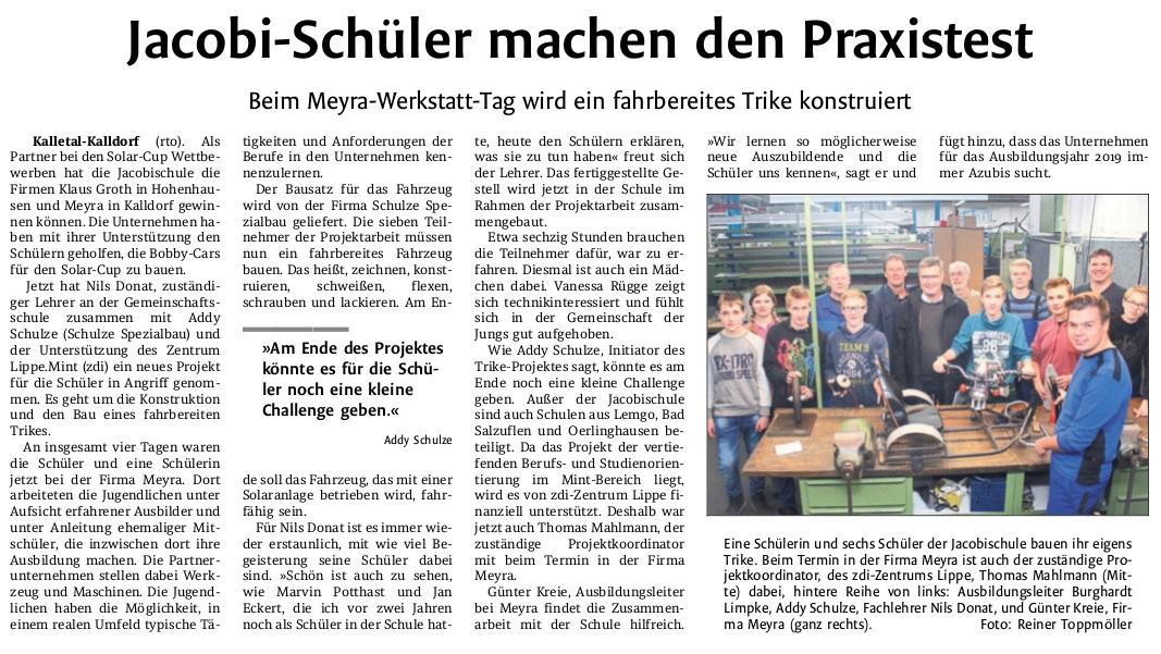 An diesem spannenden Projekt sind zahlreiche Personen beteiligt: Zum einen ist dort die Schrauber-AG von Nils Donat, die sich im Sommer auf das Bobbycar Solarrennen konzentriert (sie treten dort in riesige Fußstapfen des Erfolgsteams, wie Sie hier lesen können). Zum anderen ist dort der Lemgoer Erfinder Addy Schulze von Schulze Spezialbau, der die Schulen immer wieder mit seinen Ideen bereichert. Und dann sind da noch die Firma Meyra und zwei ihrer Auszubildenen, die beide ehemalige Schüler unserer Schule sind sowie Herr Mahlmann vom zdi Lippebildung, der das Projekt finanziell unterstützt.