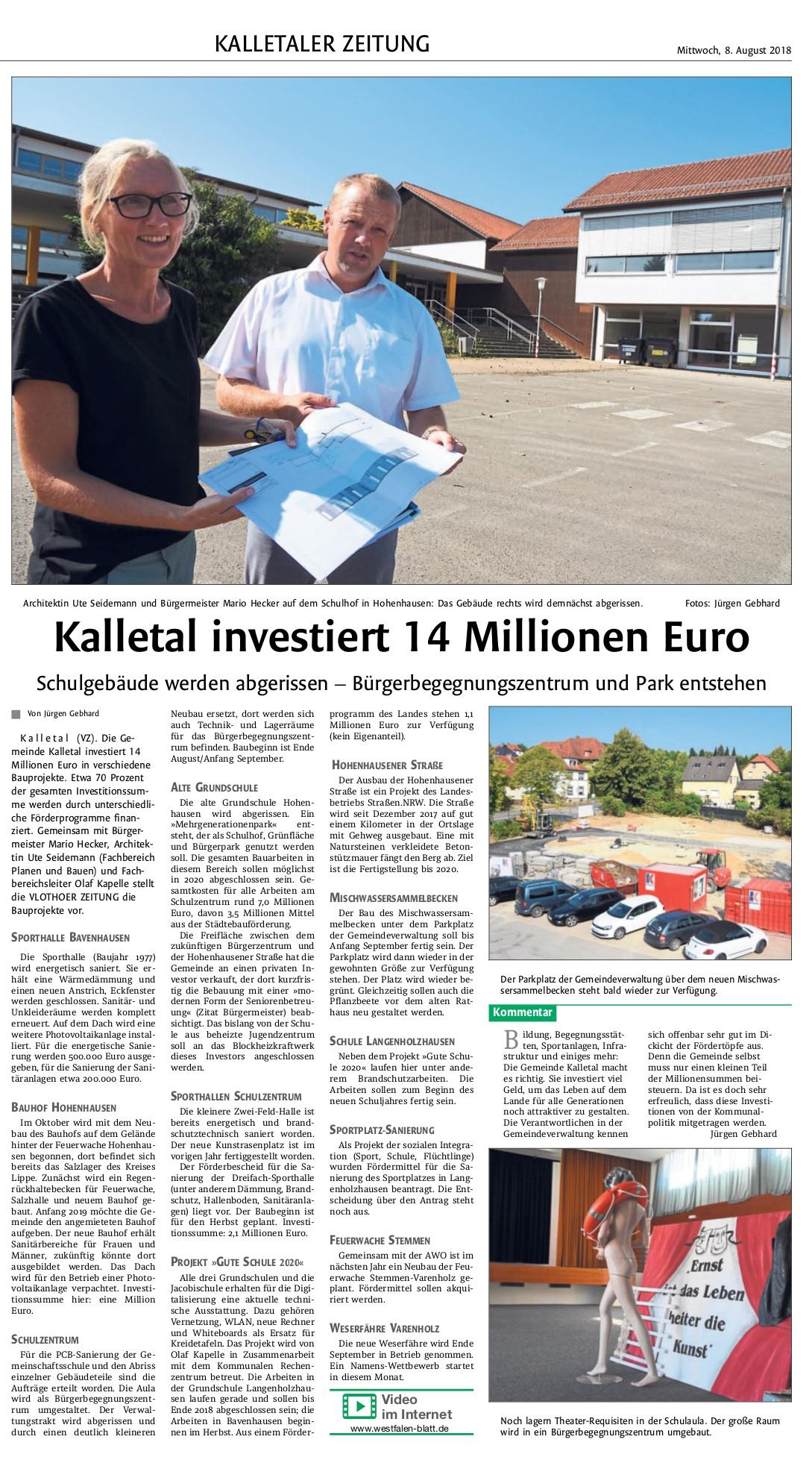 Im Westfalenblatt vom 8. August 2018 informierte die Gemeinde Kalletal über ihre umfangreichen Bau- und Sanierungsvorhaben, die auch unser Schulzentrum betreffen. Lesen Sie den Artikel hier und freuen Sie sich mit uns auf ein modernes Schulzentrum!