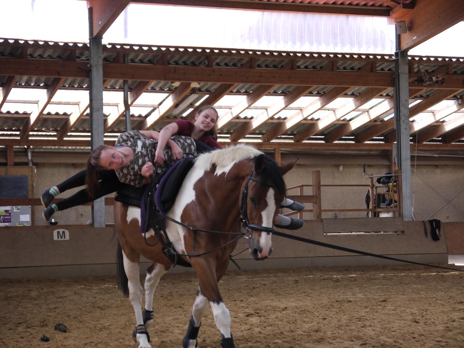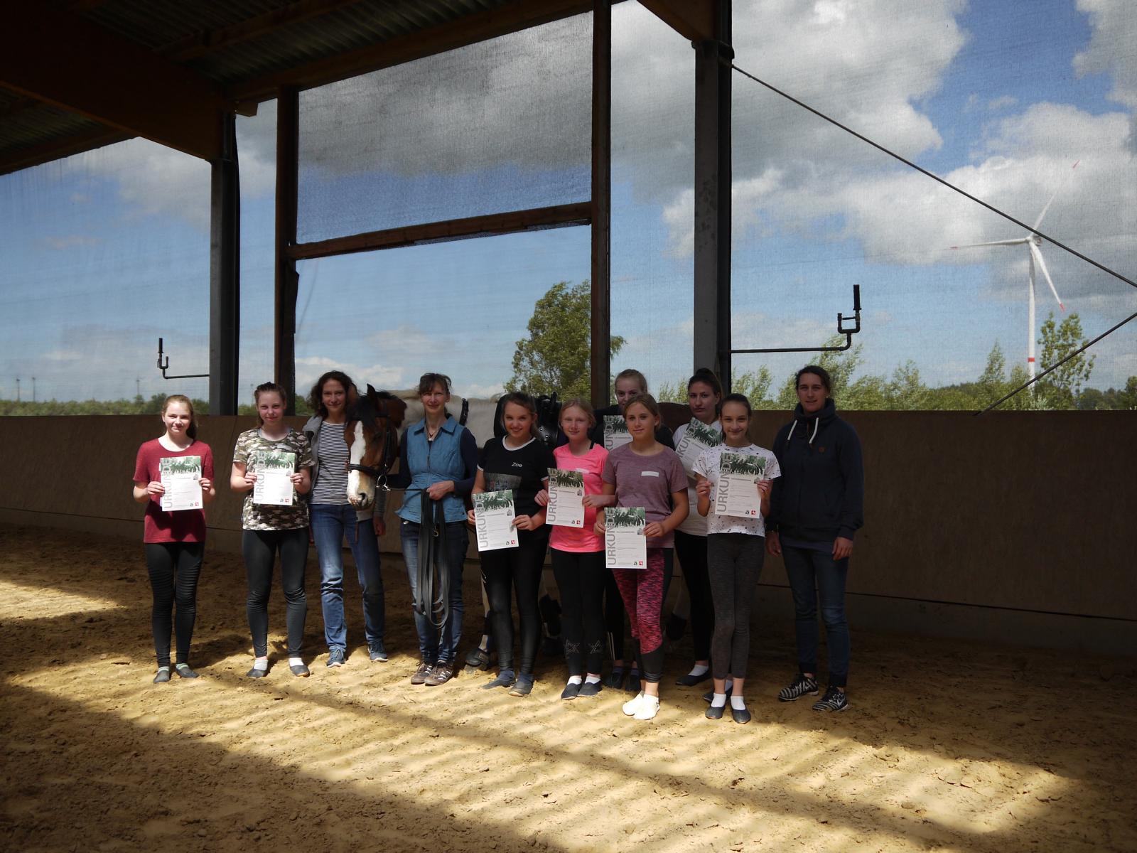 Auf dem Windmühlenhof in Bavenhausen hatte die Mädchengruppe ein Jahr lang geübt und trainiert und stellte jetzt das Gelernte beim Ablegen des Motivationsabzeichens unter Beweis: Pferdekunde, der Umgang mit dem Pferd und natürlich das Voltigieren wurden präsentiert. Im Schritt und Galopp zeigten die Mädchen alleine und zweit verschiedene Übungen auf dem Pferd. Trotz der Aufregung und der Anspannung vor der Prüfung hatten es schließlich alle geschafft und erhielten am Ende des Nachmittags stolz ihre Urkunden und Anstecknadeln.