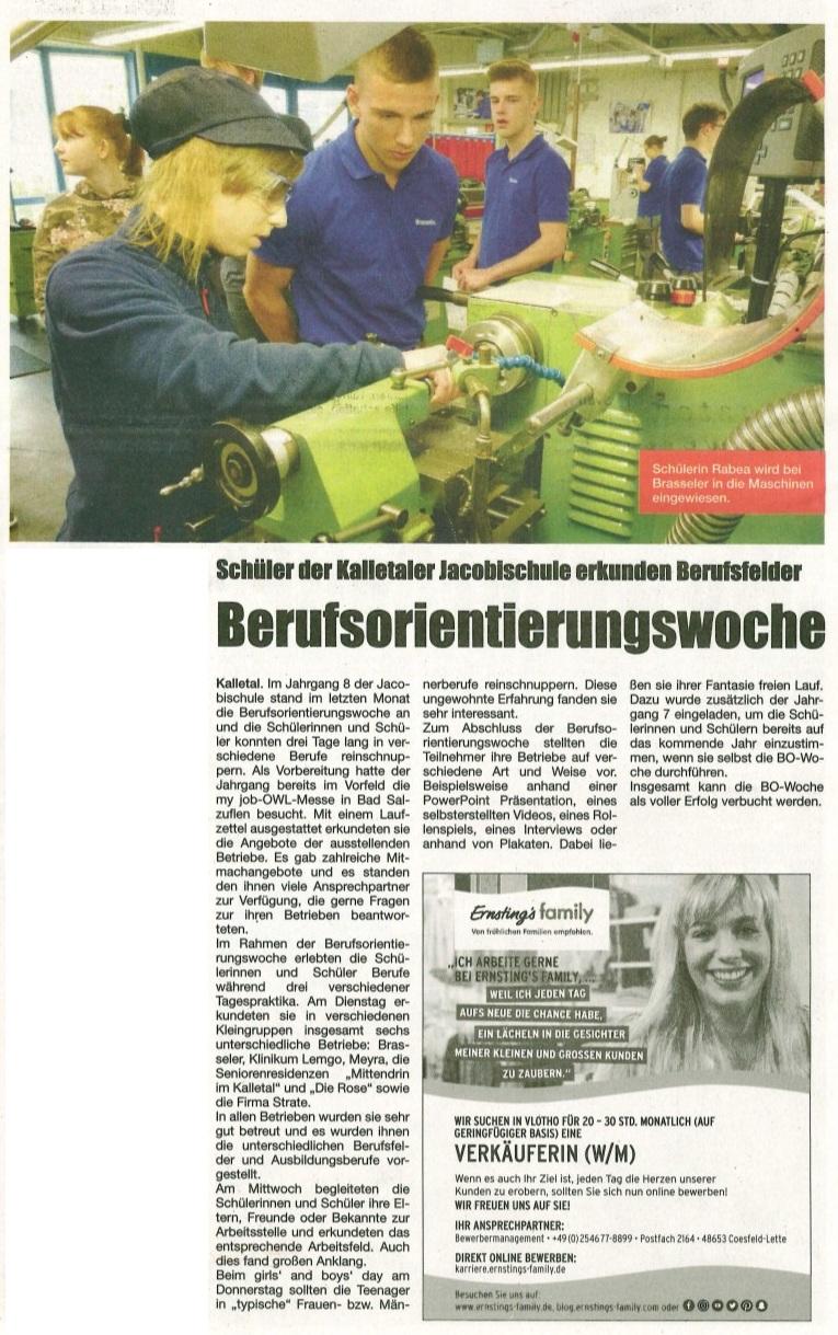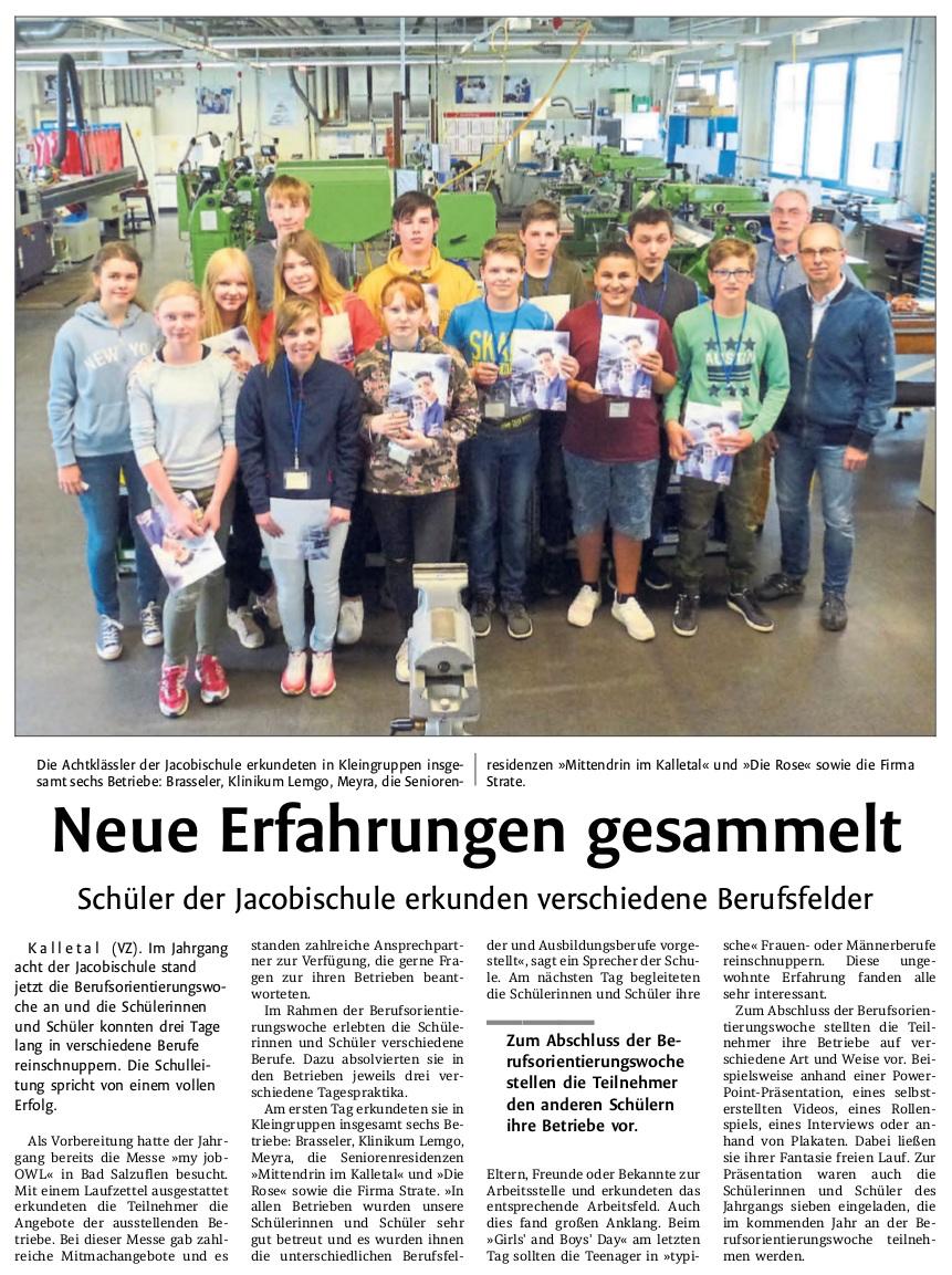 Im Rahmen der Berufsorientierungswoche erlebten die Schülerinnen und Schüler Berufe während drei verschiedener Tagespraktika. Am Dienstag erkundeten sie in verschiedenen Kleingruppen insgesamt sechs unterschiedliche Betriebe, wobei sie sich für einen Betrieb vorher entscheiden konnten. Zu diesen Betrieben gehörten: Brasseler, Klinikum Lemgo, Meyra, die Seniorenresidenzen „Mittendrin im Kalletal“ und „Die Rose“ sowie die Firma Strate.