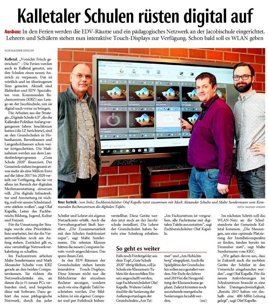 Das Schulzentrum erhält einen neuen Server, eine neue Netzwerkverkabelung und somit deutlich schnelleres Internet. Außerdem erhält die Jacobischule 2 neue PC-Räume, die topmodern ausgestattet sind. Zudem gibt es in den Räumen und auch in weiteren Fachräumen im Fachzentrum neue, riesige Touchscreendisplays. Digitaler Unterricht 4.0 kann im Kalletal kommen. Wir freuen uns!