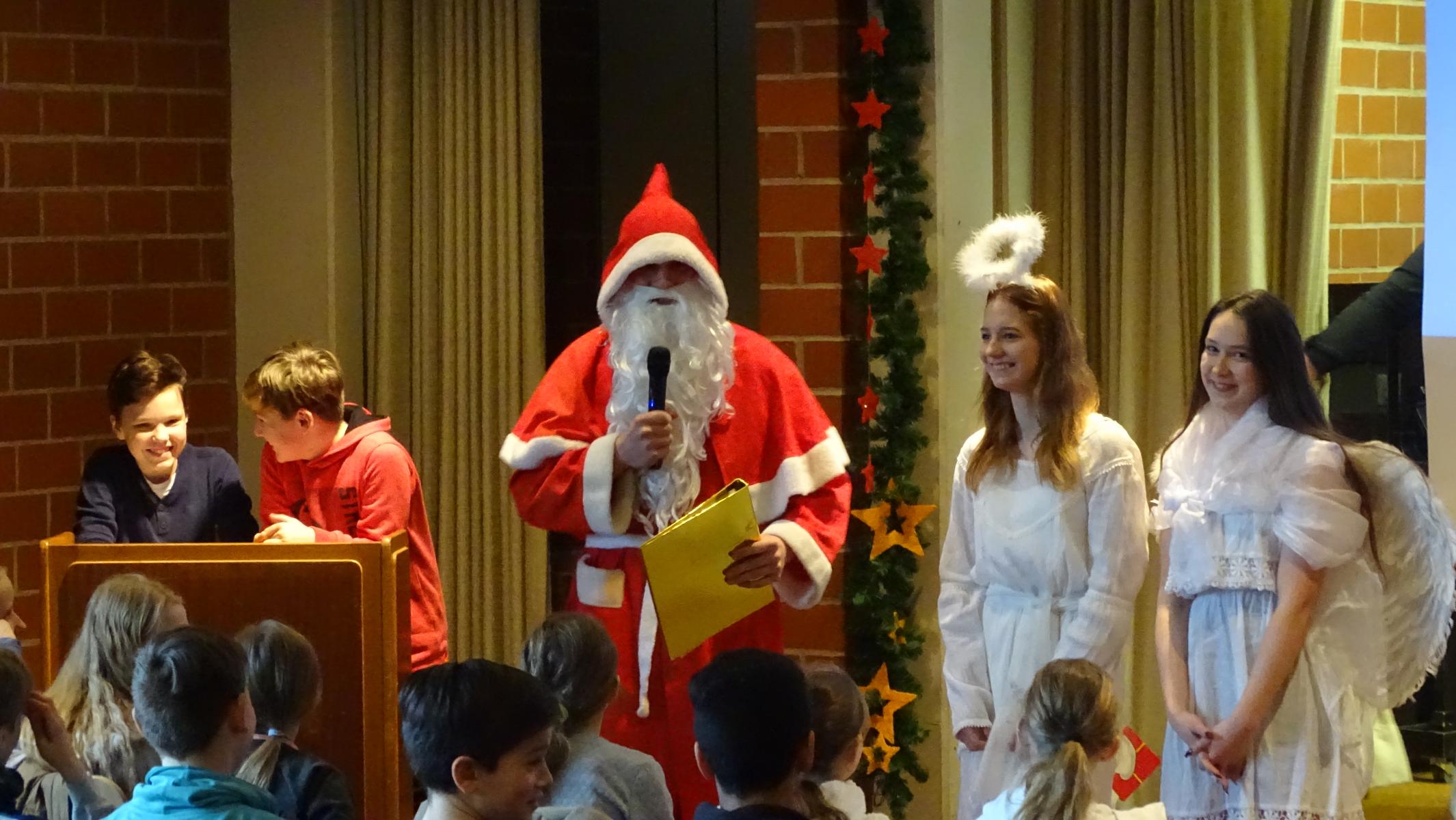 Kurz vor Ende der Feier fand auch der Weihnachtsmann noch den Weg zu uns. Nachdem er einigen Kindern Lob und Ermahnungen aus seinem goldenen Buch vorgelesen hatte, beauftragte er seine Engel, allen Kindern ein kleines Geschenk aus der Weihnachtsbäckerei mit auf den Weg zu geben.