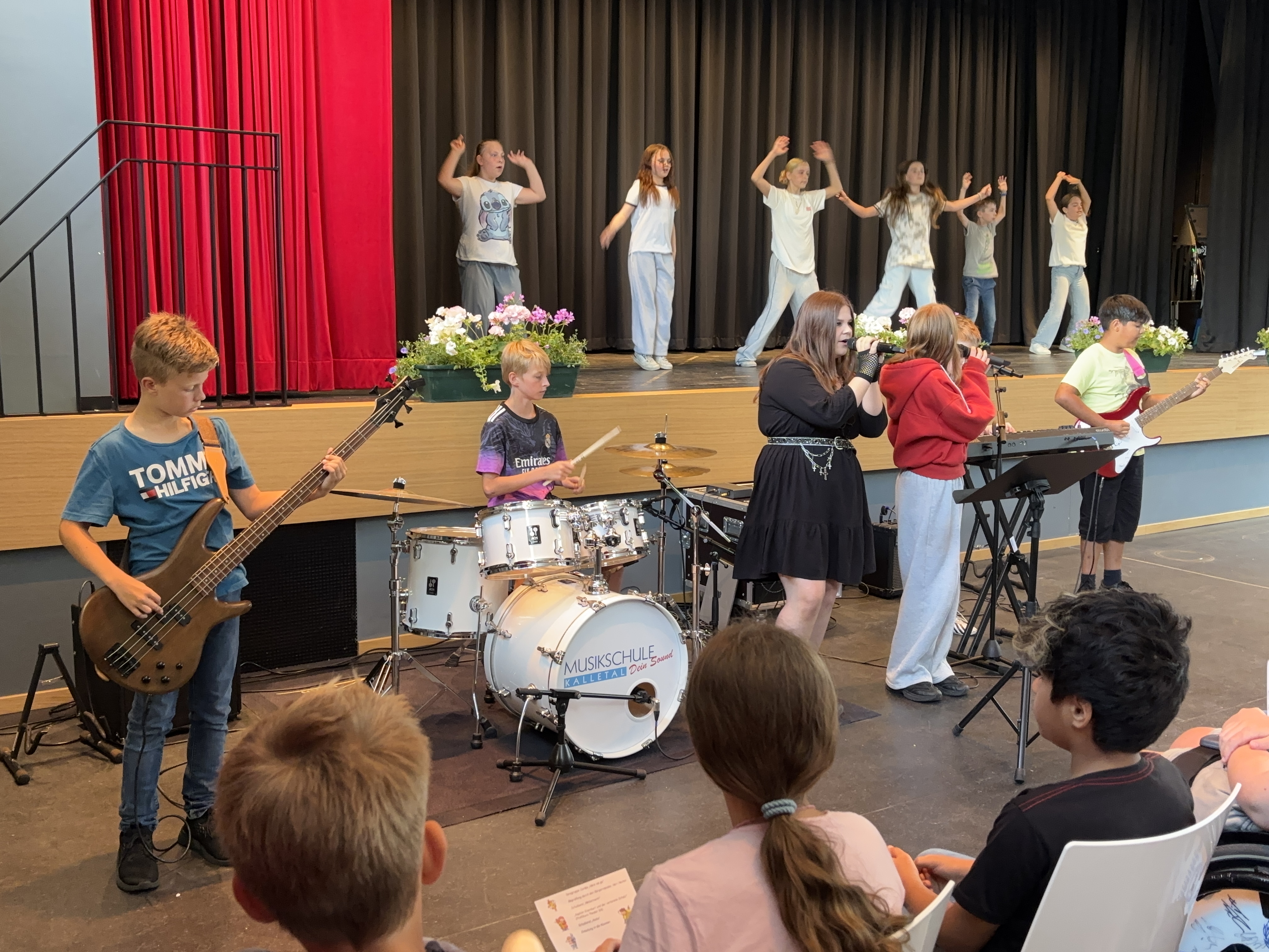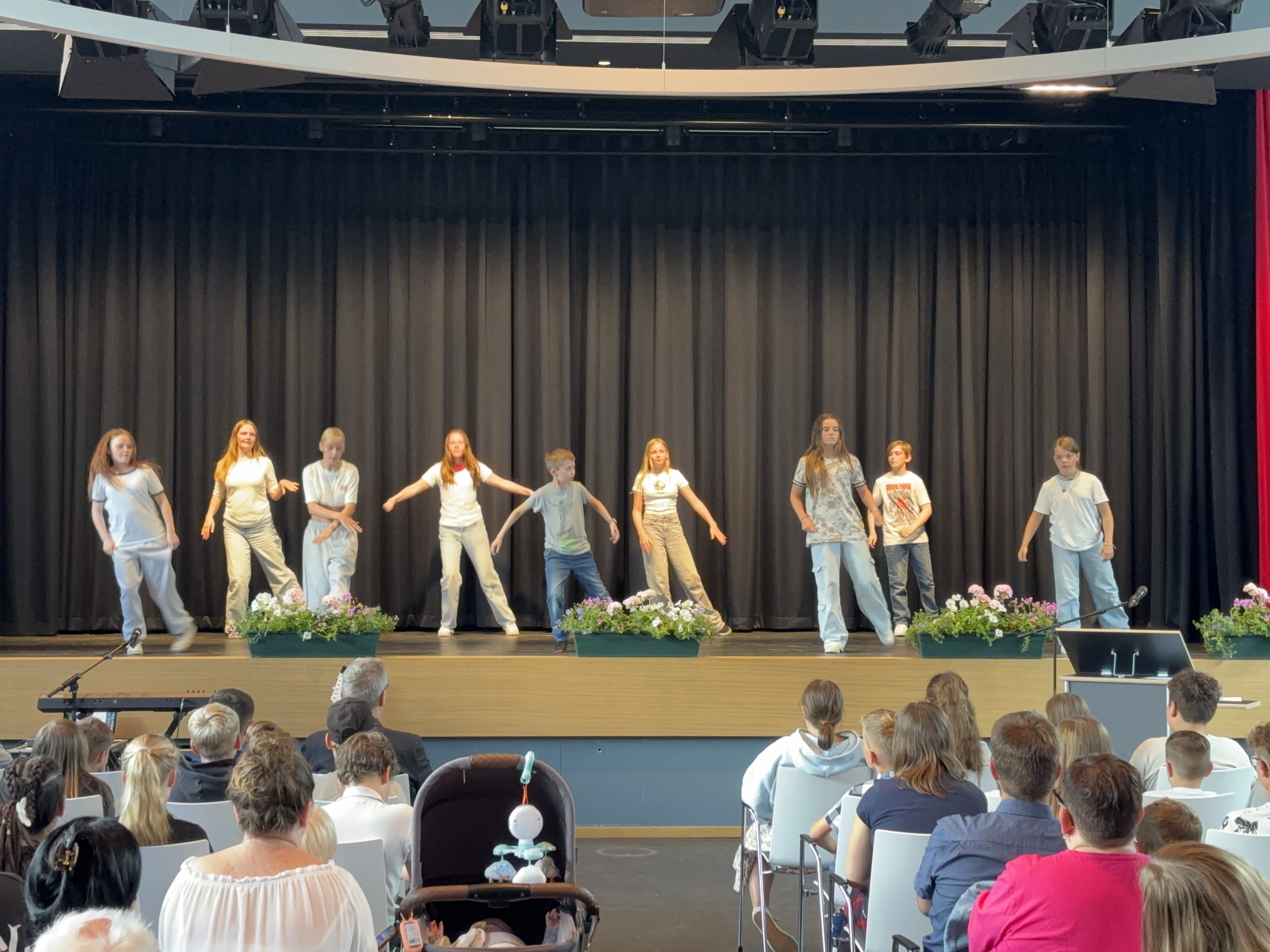Am Montagnachmittag (07.07.), wurde es wieder voll im BBZ. 75 (noch!) Grundschülerinnen und Grundschüler waren mit Eltern und Geschwistern in die Aula gekommen, um zu erfahren, mit wem man denn nun in den nächsten 6 Jahren gemeinsam im Unterricht sitzt und wen man als neues Klassenlehrerteam bekommt. Begrüßt wurden die Gäste traditionell durch die jetzigen fünften Klassen, die mit ihren Profilkursen ein fantastisches und buntes Programm auf die Beine gestellt hatten. Es wurde moderiert, getanzt, gesungen und mitreißend gespielt, sehr zur Freude der Zuschauer. Auch der Schulleiter Dr. Eike Stiller und der Bürgermeister Mario Hecker begrüßten die zukünftigen Lernenden mit aufbauenden Worten. Was zähle sei die Freundlichkeit und der gute Umgang untereinander und die Gemeinsamkeit beim Erreichen eines Zieles. Das zeigte auch der Theaterkurs: Mit Freundlichkeit und Spaß gelang es allen gemeinsam dem mürrischen Krokodil den Schatz abzuringen, wo man mit bloßer Gewalt nicht weitergekommen war. Im Anschluss daran ging es für die „Neuen“ in die Klassenräume, wo man sich schon ein bisschen kennen lernen konnte, während Eltern und Gäste in der Mensa mit Kaffee und Kuchen durch das Serviceteam von Frau Kahl versorgt wurden. Hier nochmals vielen Dank für die tollen Kuchenspenden aus dem Jahrgang 5! An so einem Nachmittag kann man spüren, wie gut alles funktioniert, wenn man es gemeinsam macht!