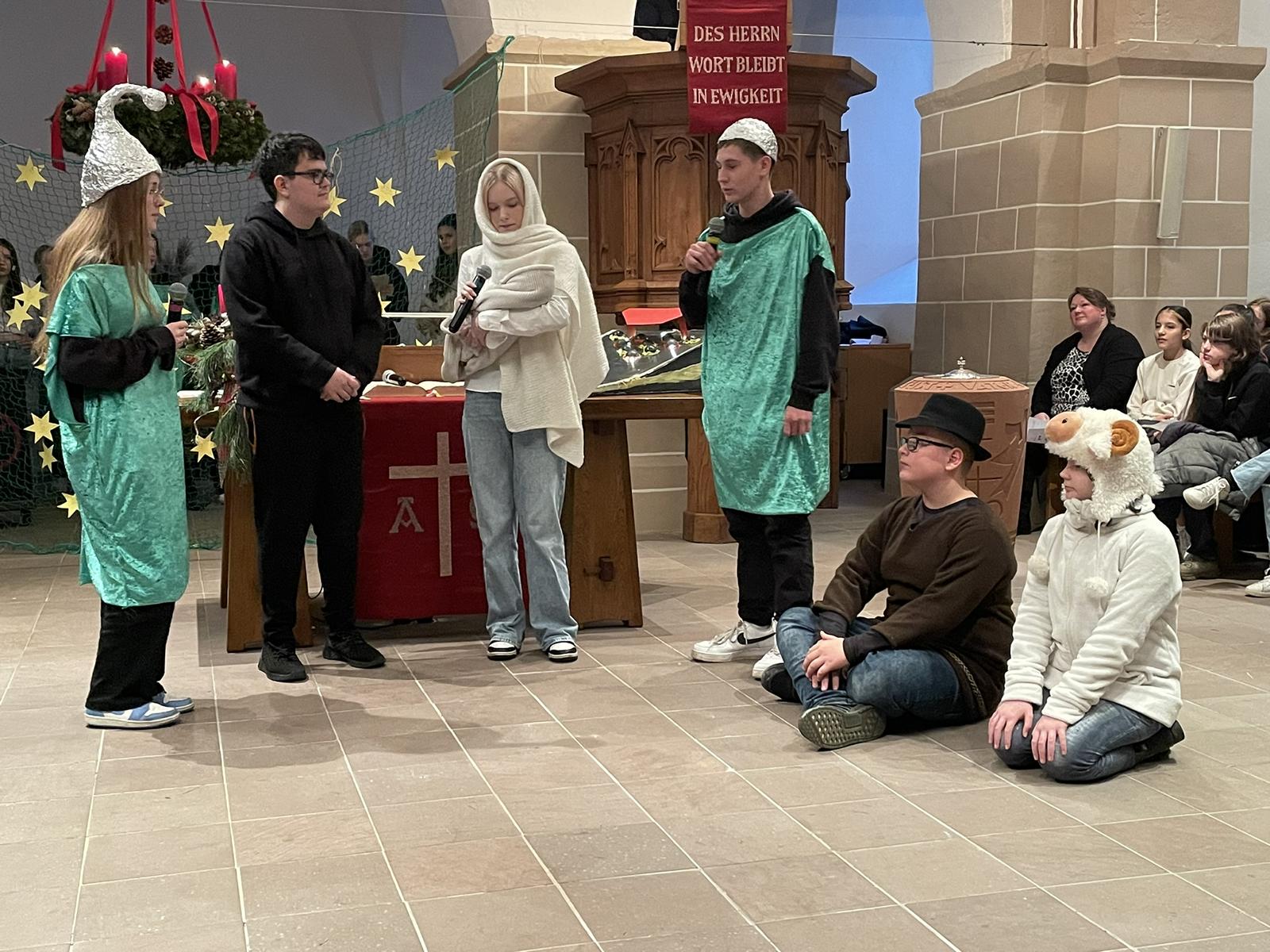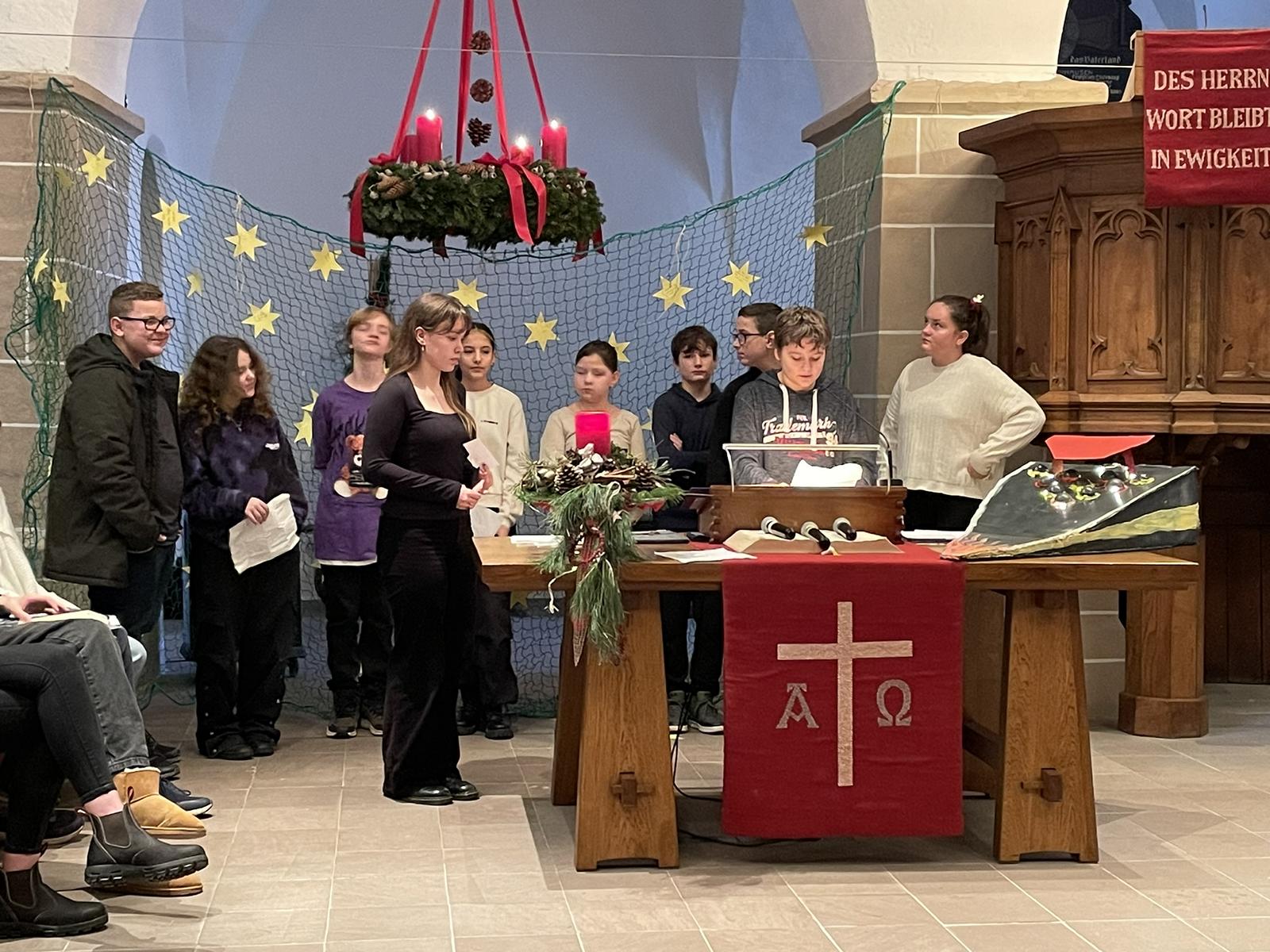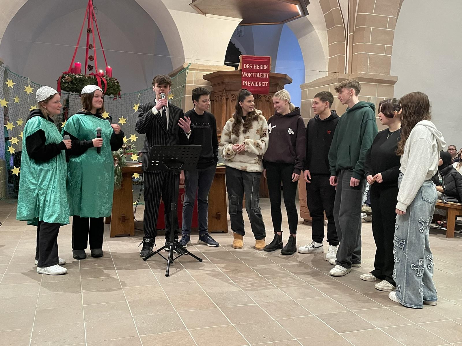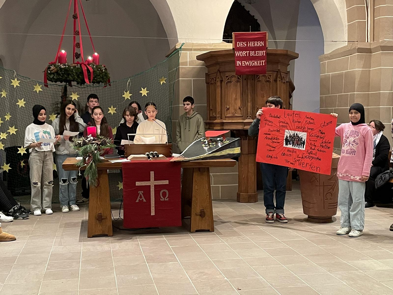 Im Religionsunterricht hatten sich viele Klassen und Kurse in den Wochen zuvor damit beschäftigt, wie die Botschaft von der Geburt Jesu auf unser Miteinander in der heutigen Zeit ausstrahlen kann. In einem szenischen Anspiel, das einen Bogen von der Krippe von Bethlehem zum Weltraum schlug, in Statements und vielen musikalischen Beiträgen machten insgesamt über 80 Mitwirkende auf vielerlei Weise deutlich, dass man als Mensch täglich vor die Entscheidung zwischen Gut und Böse gestellt ist und man sich im Sinne von Respekt und Toleranz für Ersteres entscheiden sollte. Damit verknüpft sich der Wunsch, dass sich die Gedanken des Gottesdienstes auch im Nachhinein positiv auf das Miteinander in der Schule sowie in anderen Lebensbezügen auswirkt. Besonders berührend war zudem für alle Besucher der Auftritt der Schülerinnen und Schüler der „Internationalen Klasse“, der zeigte, wie schnell Integration gelingen kann.