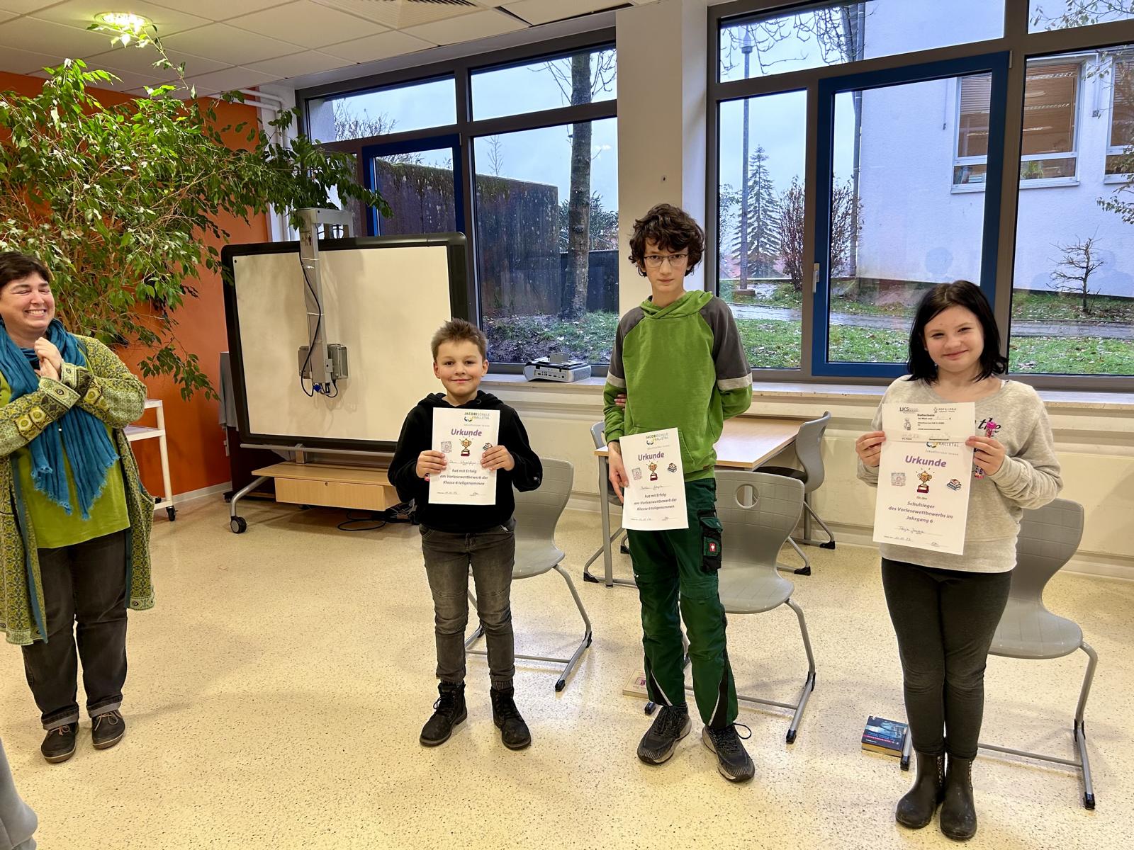 Heute, am 11.12., ist das aber drei Schülerinnen und Schülern der sechsten Klassen beim diesjährigen Lesewettbewerb gut gelungen. Die drei hatten schon jeweils in ihren Klassen vorgelesen und waren als die besten Leser in den Wettkampf geschickt worden. Devin Schwertfeger aus der 6b, Balduin Kempken und Tarja Jenssen aus der 6a traten gegeneinander an. Mit sehr unterschiedlichen Texten (einem Abenteuerroman, einem Sachbuch über Kriegskunst und einem Krimi) bewiesen die drei ihre hohe Lesekompetenz. Auch ein unbekannter Text musste vorgelesen werden und hier zeigte es sich dann, wer die Nase ein Stückchen weiter vorne hatte.