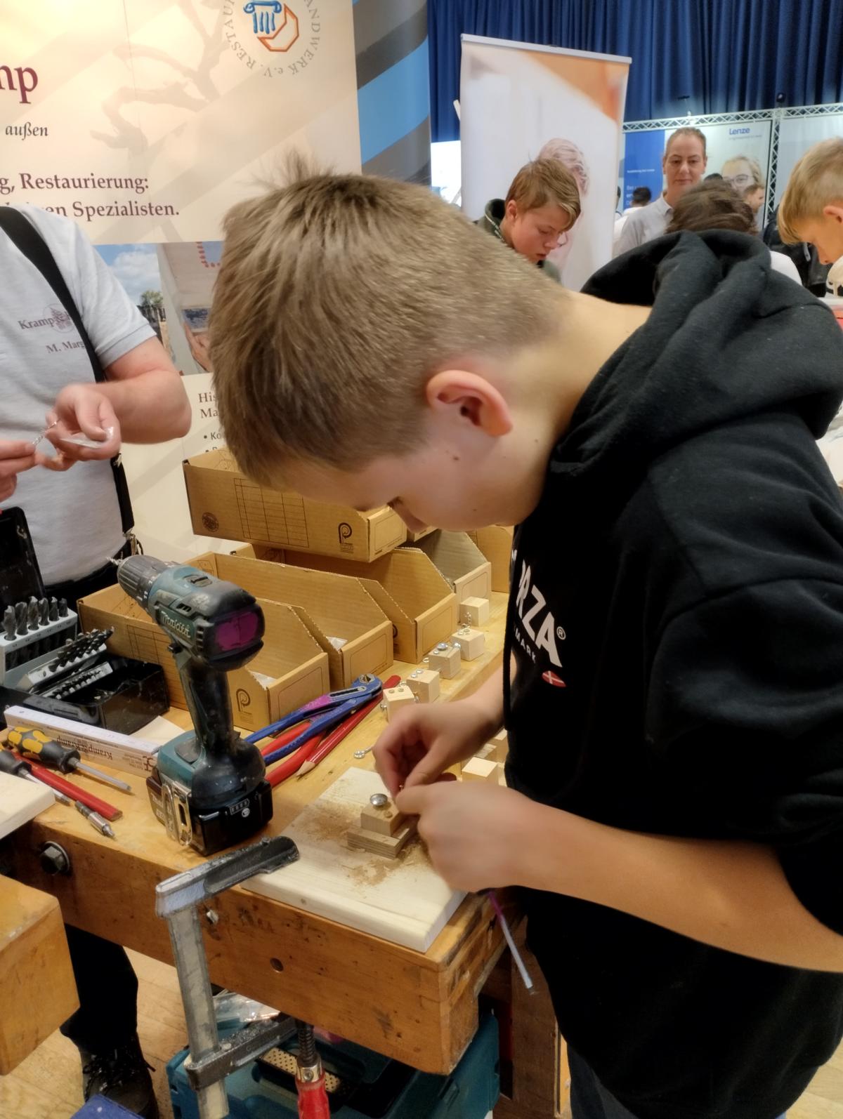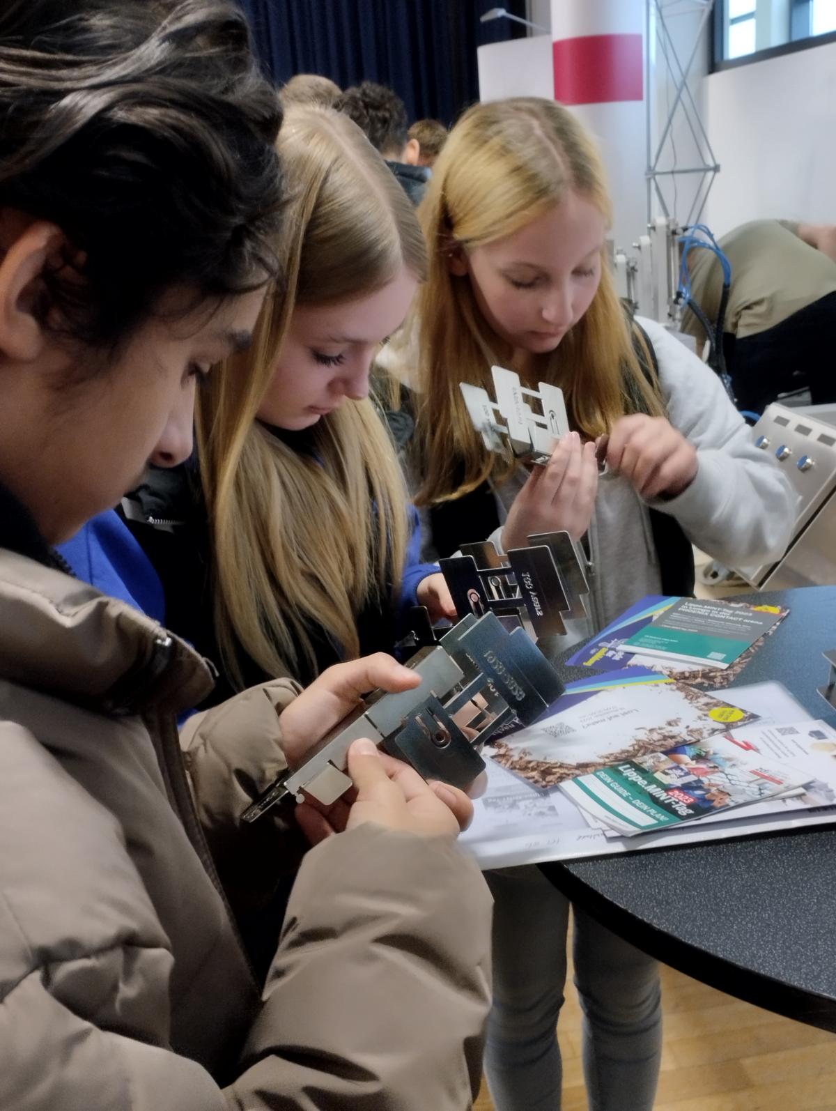 Zahlreiche Firmen und Ausbildungsbetriebe aus der Region präsentierten sich dort, um potentielle zukünftige Bewerberinnen und Bewerber für Berufe aus dem Bereich Mathe/Informatik/Naturwissenschaft/Technik (MINT) zu begeistern. Die kreativ gestalteten Stände boten niederschwellige Kontakt – und Informationsmöglichkeiten für unsere Schülerinnen und Schüler aus den Jahrgängen 8 und 10. Besonders begeisterten sich diese für die zahlreichen Mitmach – Angebote, an denen u. a. solarbetriebene Miniwindräder, Gleitflieger sowie Schlüsselanhänger angefertigt werden konnten. Mit vielen neuen Eindrücken und von den “Give Aways“ gut gefüllten Taschen traten die Jugendlichen gemeinsam mit den begleitenden Lehrkräften ein wenig erschöpft, aber zufrieden den Heimweg an.